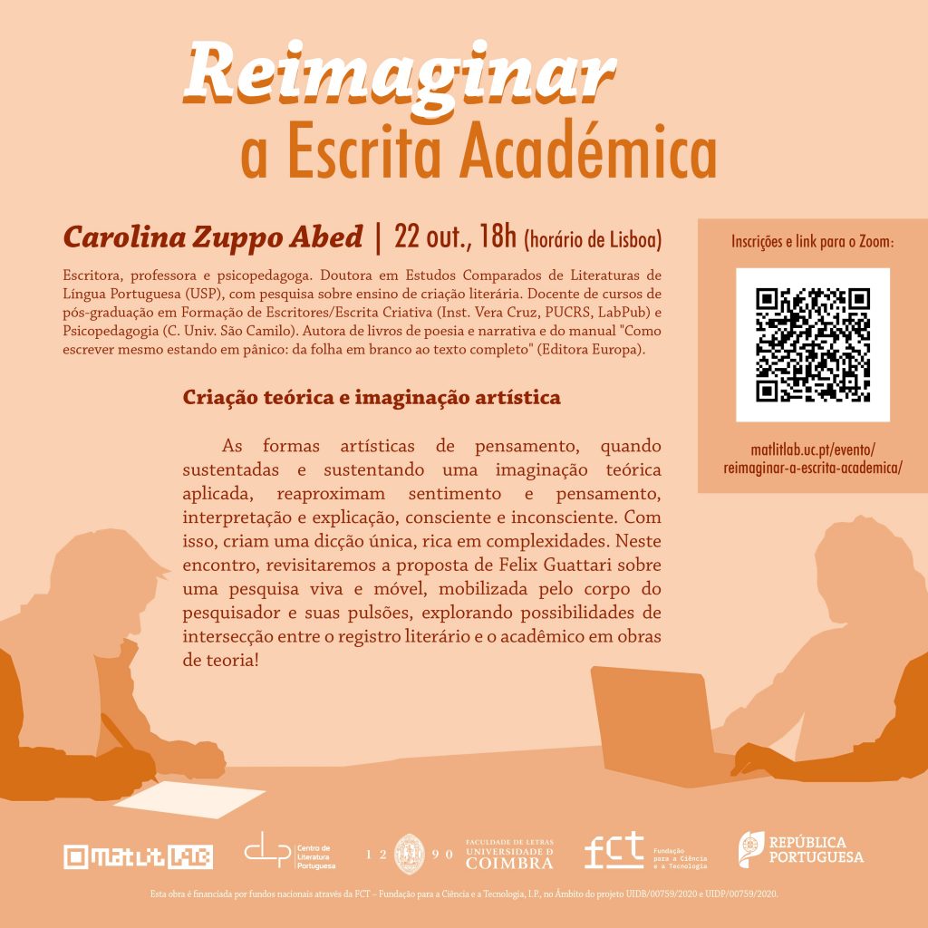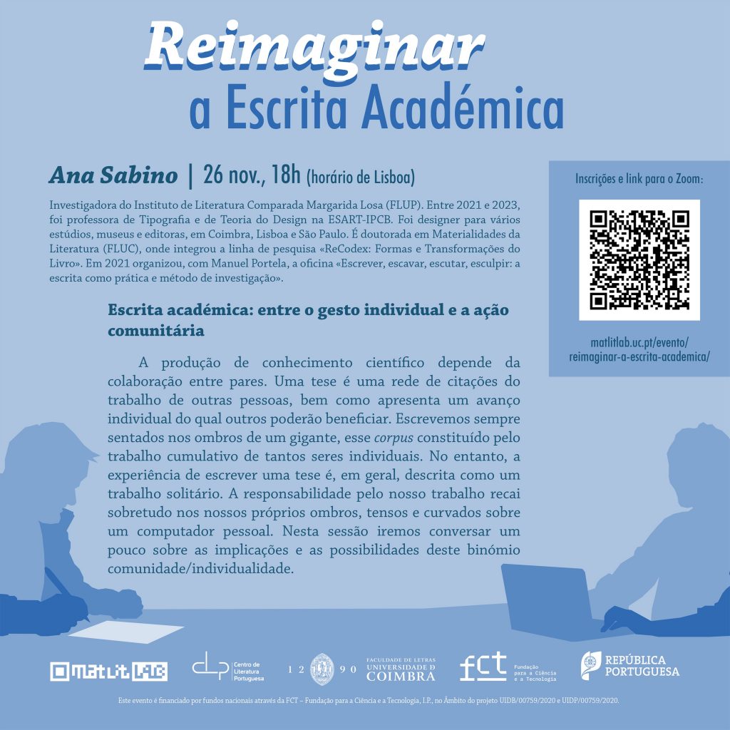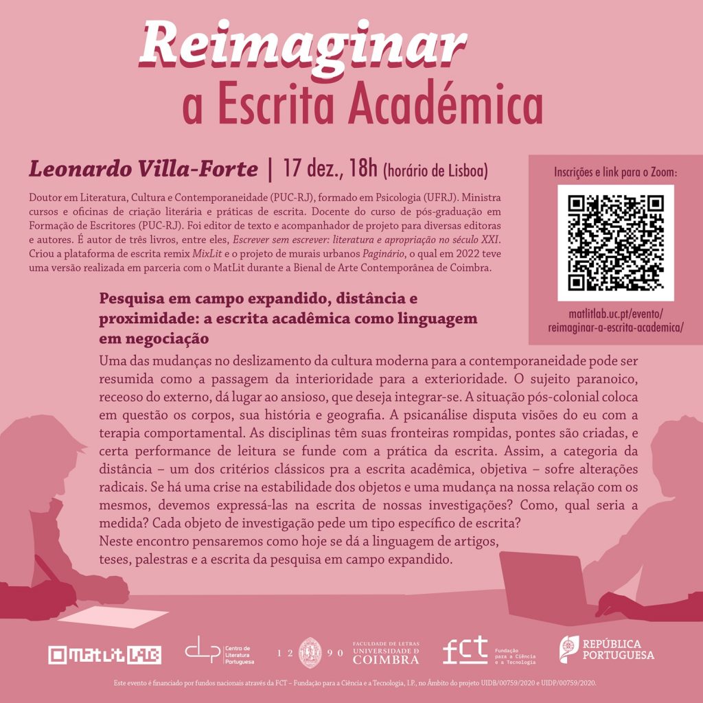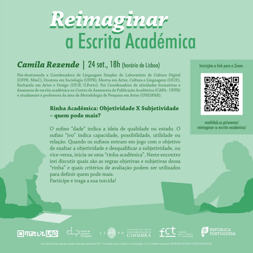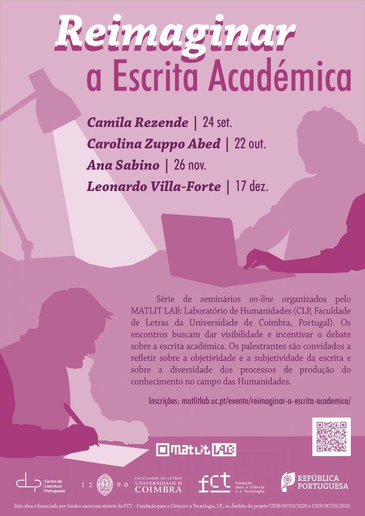 Começa hoje o ciclo “Reimaginar a Escrita Académica”, uma série de seminários on-line organizado por mim e meus colegas Elena Soressi e Diego Giménez através do MATLIT LAB: Laboratório de Humanidades do Centro de Literatura Portuguesa da Faculdade de Letras da Universidade de Coimbra. Os encontros buscam dar visibilidade e incentivar o debate sobre a escrita académica. Para Aurélien Bénel e Christophe Lejeune (2009), “a subjetividade não implica falta de rigor científico; é uma garantia do mesmo” (Humanities 2.0: documents, interpretation and intersubjectivity in the digital age). Deste modo, os palestrantes são convidados a pensar a objetividade e a subjetividade da escrita e sobre a diversidade dos processos de produção do conhecimento no campo das Humanidades.