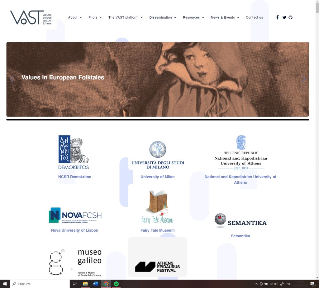 I am now part of the project VAST: Values Across Space & Time, funded by the European Union’s Horizon 2020, an international project of which the Institute for the Study of Literature and Tradition (NOVA FCSH) is one of the partners. The project aims to study the transformation of moral values across space and time, focusing on the “core European values considered fundamental for the formation of sustainable communities and enabling citizens to live well together, such as: freedom, democracy, equality, tolerance, dialogue, human dignity, the rule of law.” I am part of the team that examines the past of values in narratives expressed in natural language – in our case, in 19th century fairy tales. If you want to know more about the project, check: https://www.vast-project.eu/ There is also a platform being created that will display many of the project’s results, and can be accessed by anyone: https://platform.vast-project.eu/