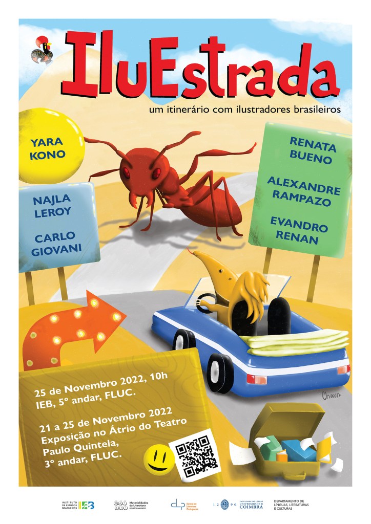 De 21 a 25 de novembro de 2022 teve lugar na Faculdade de Letras da Universidade de Coimbra o evento IluEstrada: Um itinerário com ilustradores brasileiros. A iniciativa incluiu uma exposição com o trabalho de seis ilustradores/as brasileiros/as residentes em Portugal, no átrio do Teatro Paulo Quintela (de 21 a 25 de novembro), e uma jornada com mesas redondas, no Instituto de Estudos Brasileiros (25 de novembro). A iniciativa nasceu de uma proposta minha para o Instituto de Estudos Brasileiros da FLUC, realizador do evento, que também teve o apoio do Doutoramento em Materialidades da Literatura, do Centro de Literatura Portuguesa e do Departamento de Línguas, Literaturas e Culturas da FLUC. Eis o texto de referência do evento: