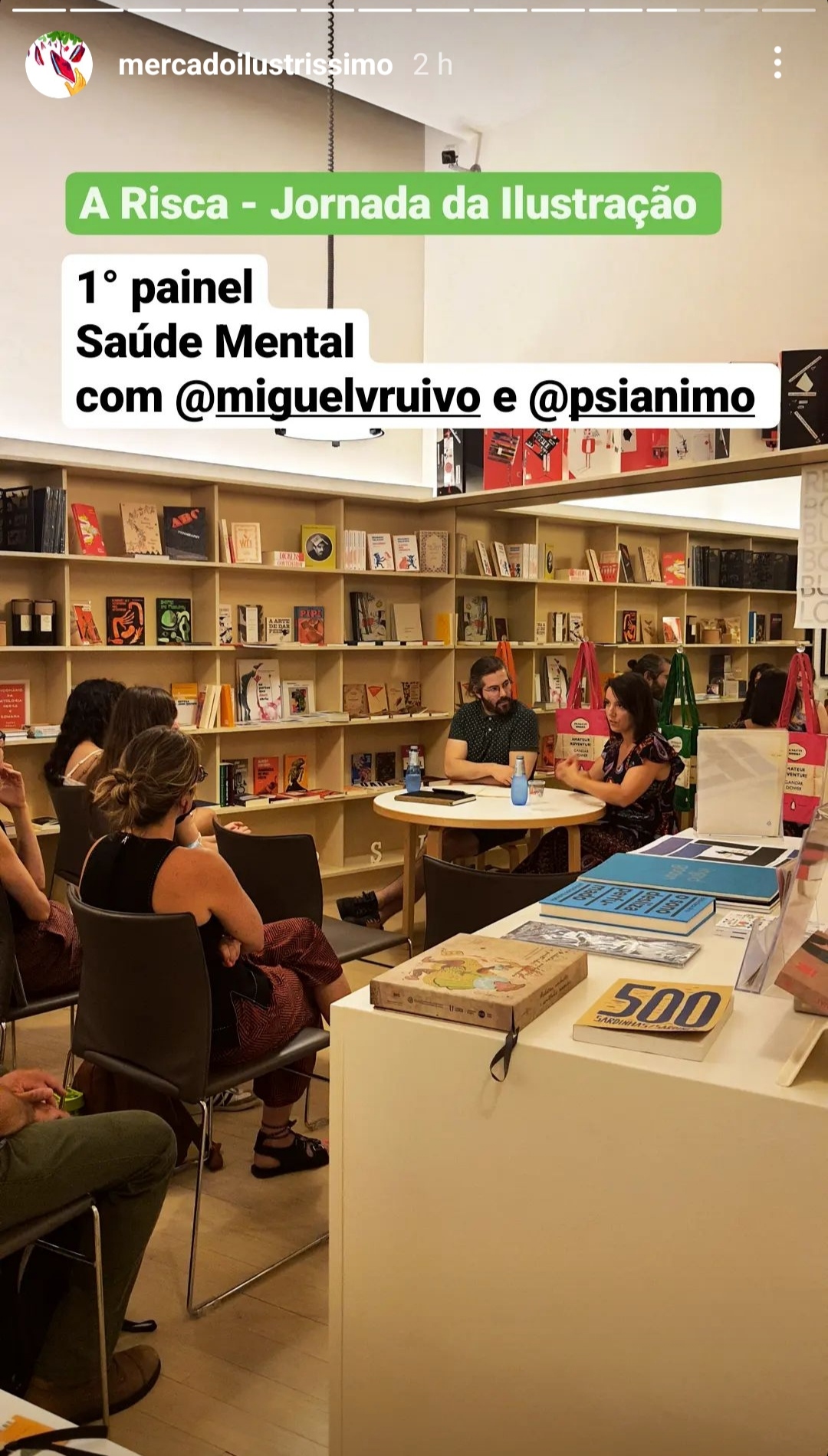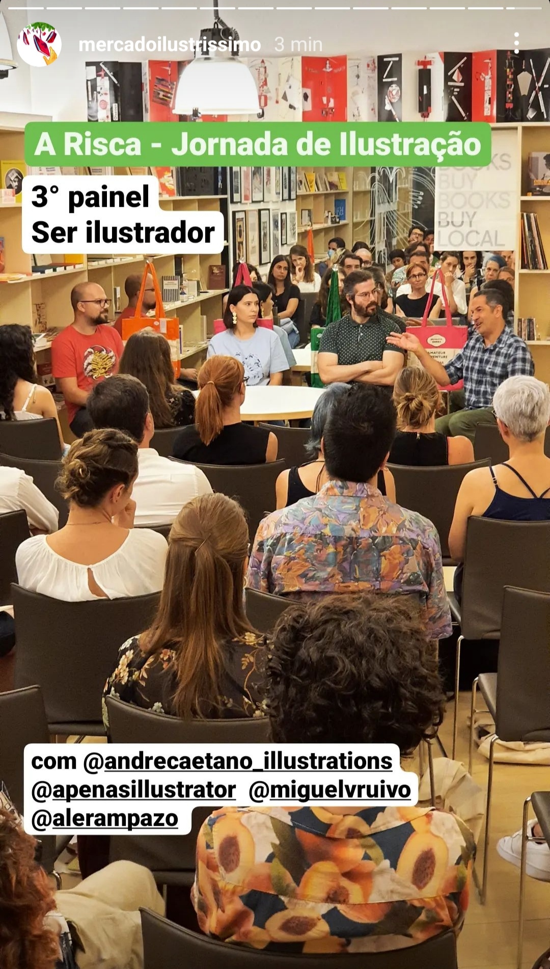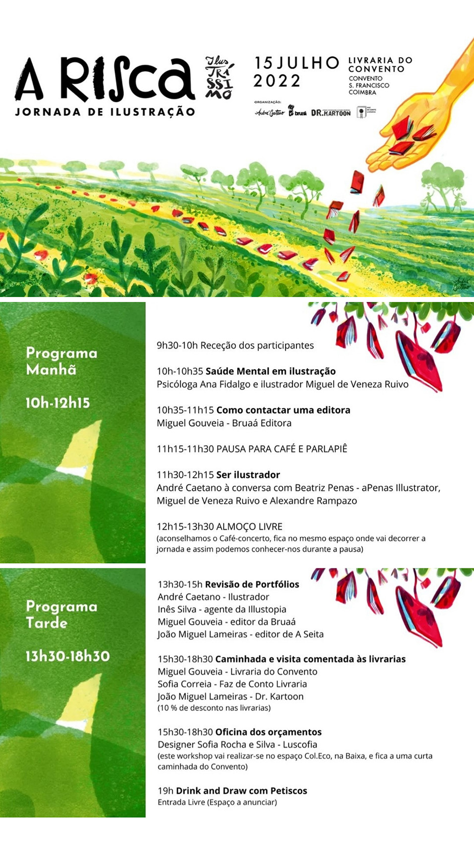 No dia 15 de julho de 2022, participei do evento “A Risca – Jornada de Ilustração”, que teve lugar na Bruaá – Livraria do Convento de S. Francisco, Coimbra (PT). A iniciativa foi organizada pelas equipes do Ilustríssimo – Mercado de Ilustração, Editora Bruaá, Livraria Dr. Kartoon e Livraria Faz de Conto. Link: https://www.instagram.com/p/Ce60KkysNJj/?hl=pt